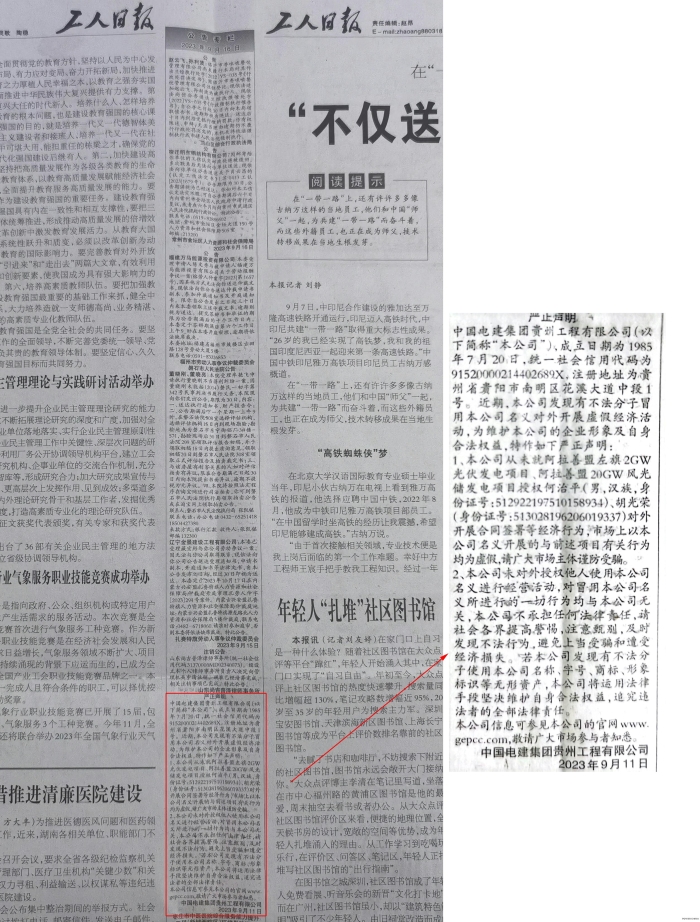 中國電建集團貴州工程有限公司(以下簡稱“本公司”),成立日期為1985年7月20日,統一社會信用代碼為91520000214402689X,注冊地址為貴州省貴陽市南明區花溪大道中段1號。 近期,本公司發現有不法分子冒用本公司名義對外開展虛假經濟活動,為維護本公司的企業形象及自身合法權益,特作如下嚴正聲明: 1、本公司從未就阿拉善盟左旗2GW光伏發電項目、阿拉善盟20GW風光儲發電項目授權何治平(男,漢族,身份證號:512922197510158934)、胡光榮(身份證號:513028196206019337)對外開展合同簽署等經濟行為,市場上以本公司名義開展的與前述項目有關行為均為虛假,請廣大市場主體謹防受騙。 2、本公司未對外授權他人使用本公司名義進行經營活動,對冒用本公司名義所進行的一切行為均與本公司無關,本公司不承擔任何法律責任,請社會各界提高警惕,注意甄別,及時發現不法行為,避免上當受騙和遭受經濟損失。若本公司發現有不法分子使用本公司名稱、字號、商標、形象標識等無形資產,本公司將運用法律手段堅決維護自身合法權益,追究違法者的全部法律責任。 本公司信息可參見本公司的官網www.xsjzl.cn,敬請廣大市場參與者知悉。 中國電建集團貴州工程有限公司 二0二三年九月十一日 |